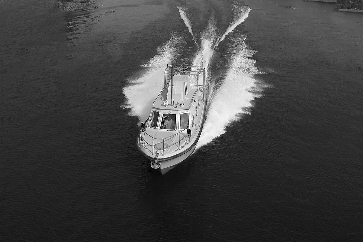 Multi-purpose work boat capable of transporting materials and men, with seating for 3 crew and 12 passengers, produced for the Indian Navy.