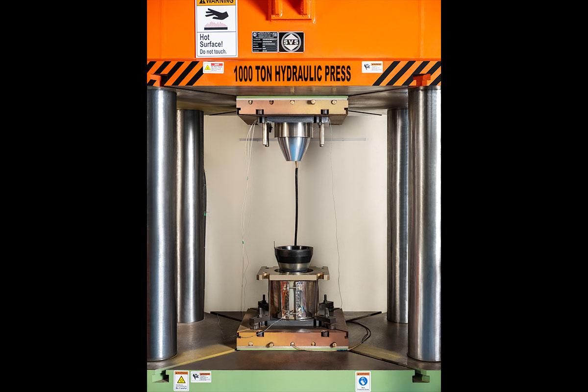 Hot press moulding of composite parts, usually ablative liners. Moulding of impregnated fabric sheets, chopped squares, and moulding compounds. Intricate geometries can be moulded, insitu if required. Up to 1000T load with heated jackets and platens of useable size 1.5m X 1.5m.